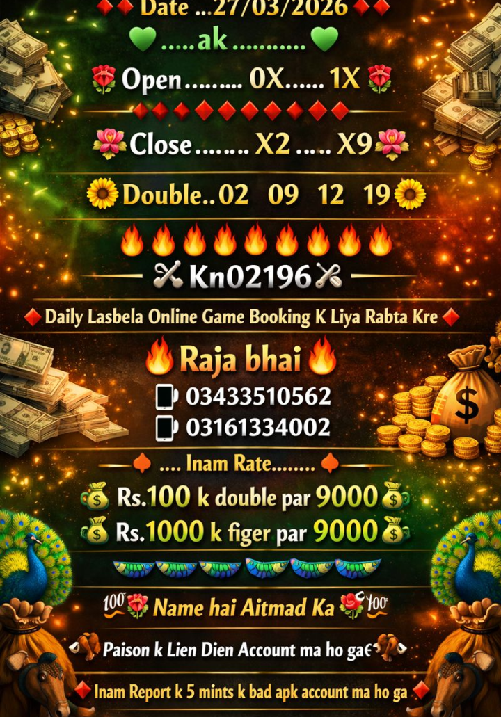 *DAILY LASBELA GAME OF KARACHI* Play Online100% Secure PK56 GM LS1 AK LS2 LS3 _ Aur inaam Rate100 ki double per inaam 9000 oor 1000 ke figure open ya close per inaam 9000